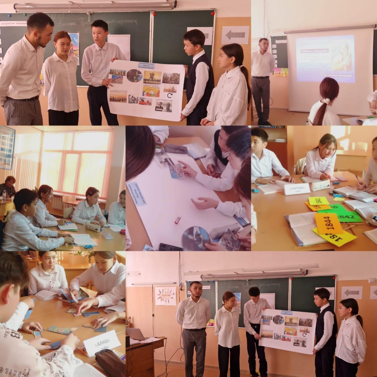 21.12.2022 күні тарих пәні мұғалімі Мұхамеднұр Д.М жетекшілігімен қазақстан тарихы пәнінен 7 “А” сыныбына “Кенесары Қасымұлы бастаған ұлт азаттық көтеріліс” тақырыбында ашық сабақ өткізілді.Ашық сабақтың басты мақсаты Кенесары Қасымұлының тұлғалық қасиеттері мен ерекшеліктерін анықтау болды. Сабақ барысында оқушылар топқа бөлініп, өз білімдерінің нақты көрсеткіштерін көрсете білді. Сабақта “Картограмма”, “Мозаика”, “Жылдар сөйлесін” белсенді әдістер қолданылды. Оқушылар сабақта белсенділік таныта отырып, жан-жақты өздерін көрсете білді.