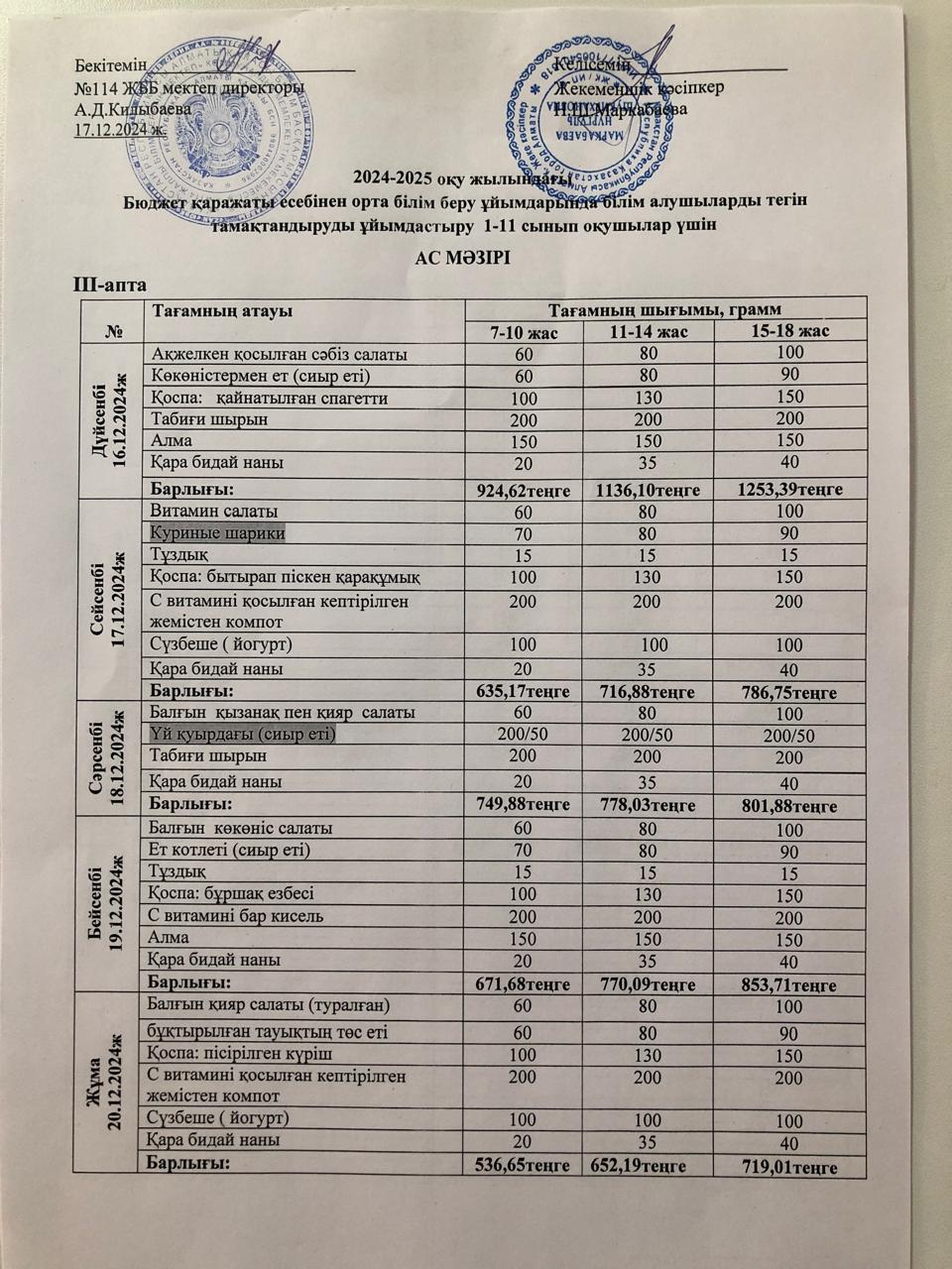 Тамақтануды ұйымдастыру бойынша жұмыс жоспары-2025