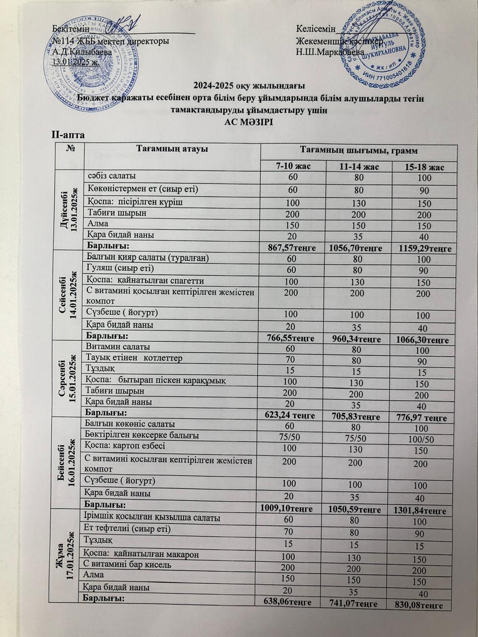 Ас мәзірі 13.01-17.01.2025 ж