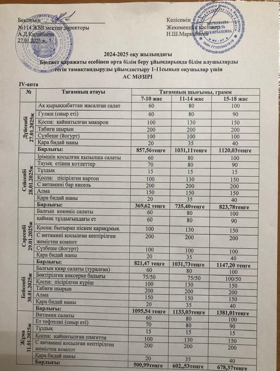 Тамақтануды ұйымдастыру бойынша жұмыс жоспары-2025