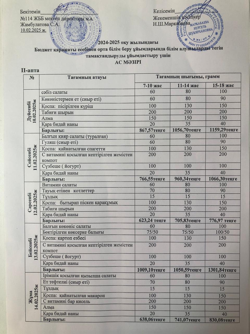 Тамақтануды ұйымдастыру бойынша жұмыс жоспары-2025