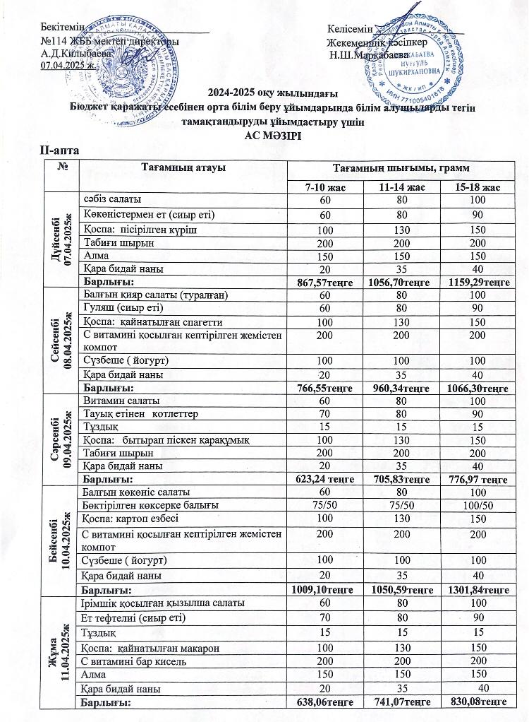 Тамақтануды ұйымдастыру бойынша жұмыс жоспары-2025
