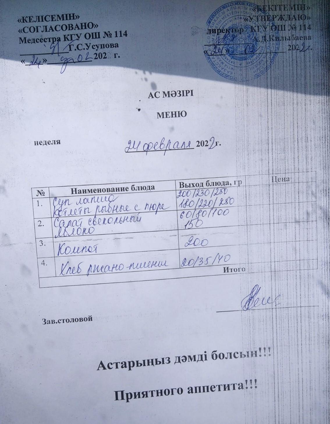 Тамақтану бойынша келісім шарт- 2023-2024ж