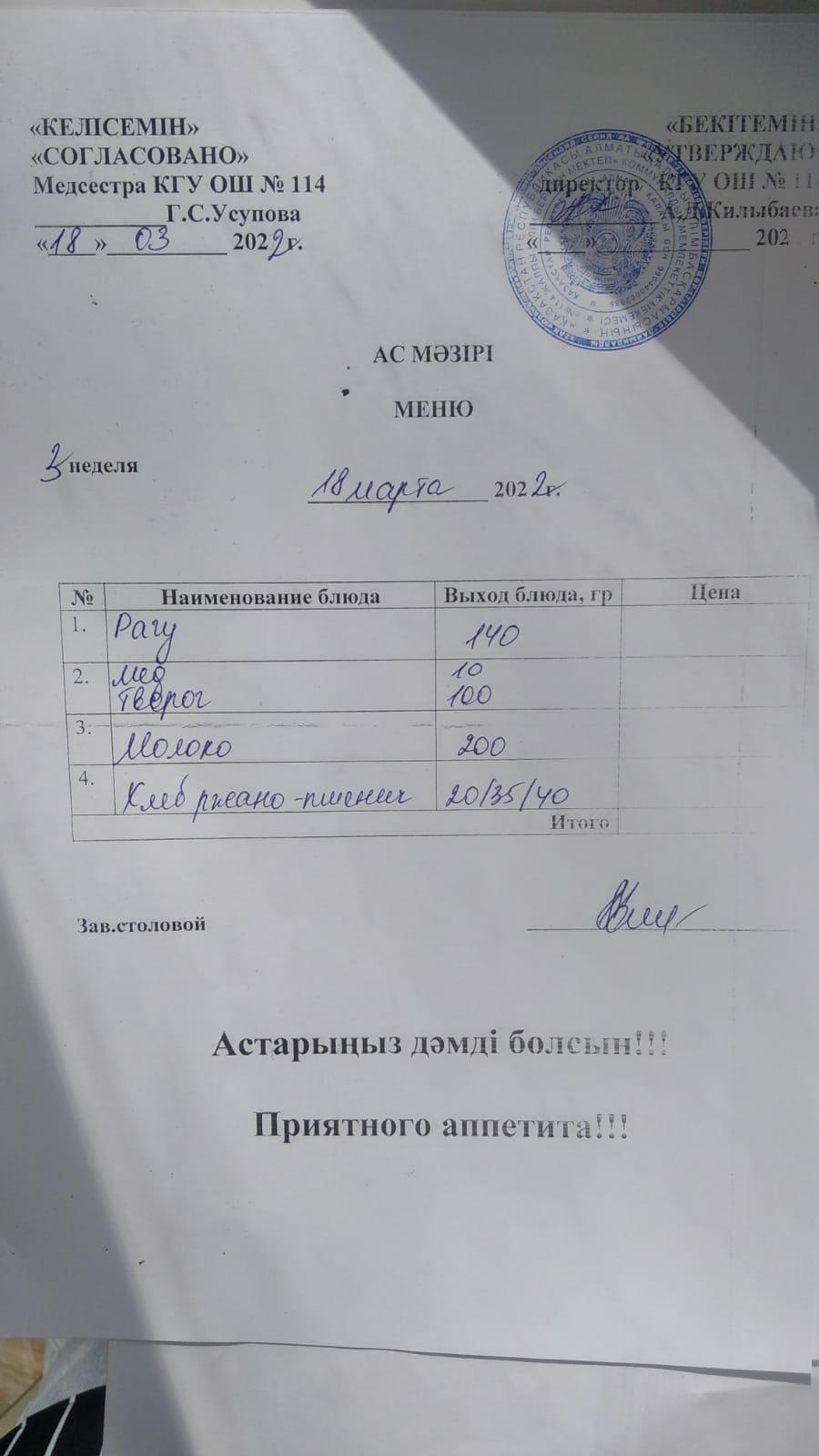 Тамақтану бойынша келісім шарт- 2023-2024ж