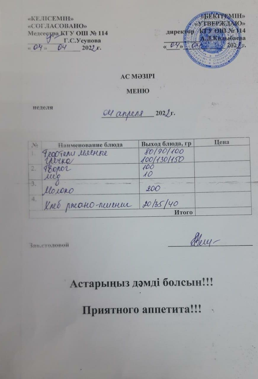 Тамақтану бойынша келісім шарт- 2023-2024ж