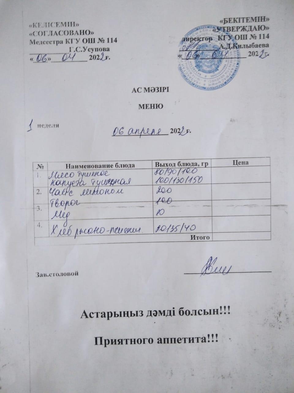 Тамақтану бойынша келісім шарт- 2023-2024ж