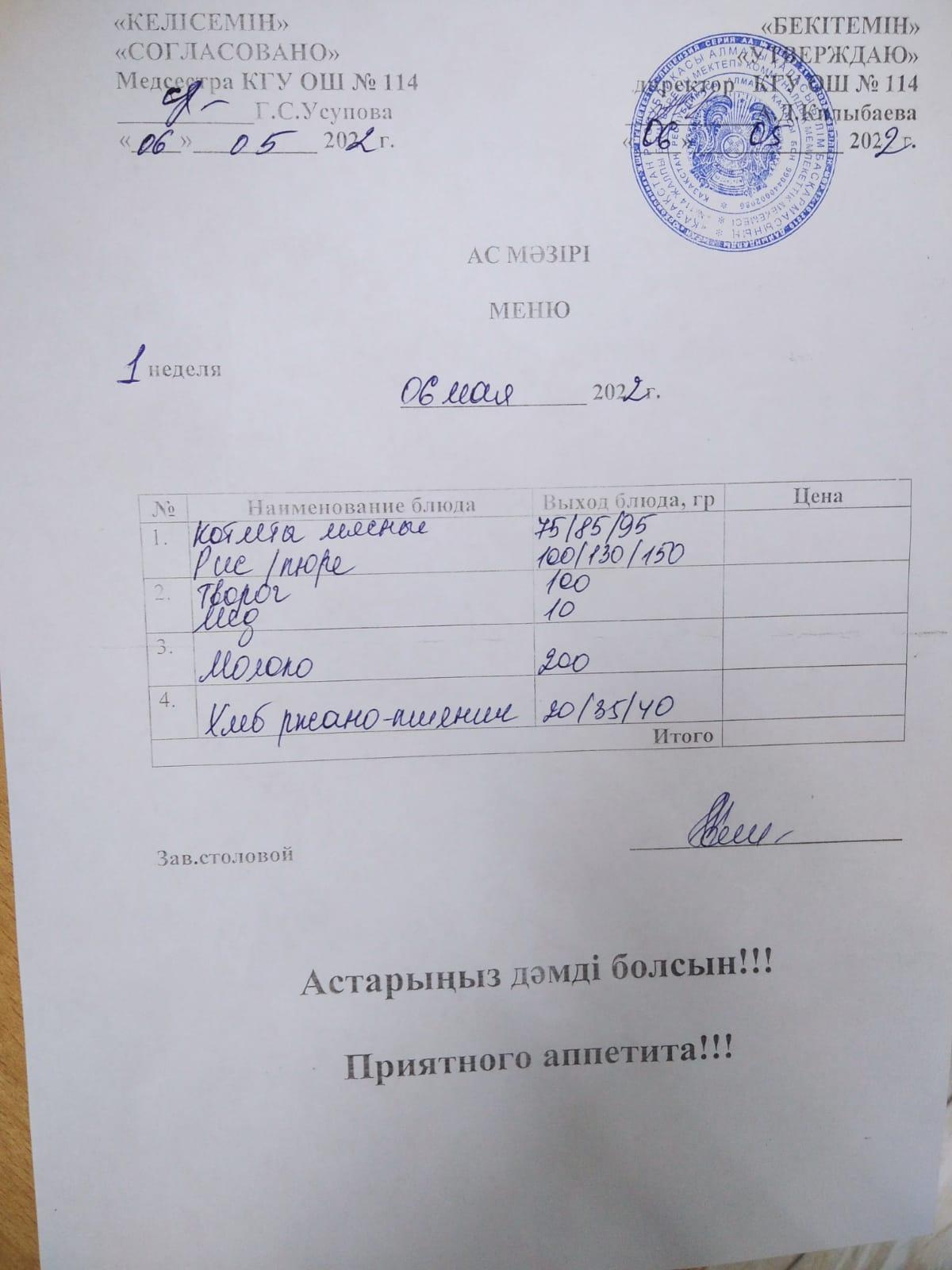 Тамақтану бойынша келісім шарт- 2023-2024ж