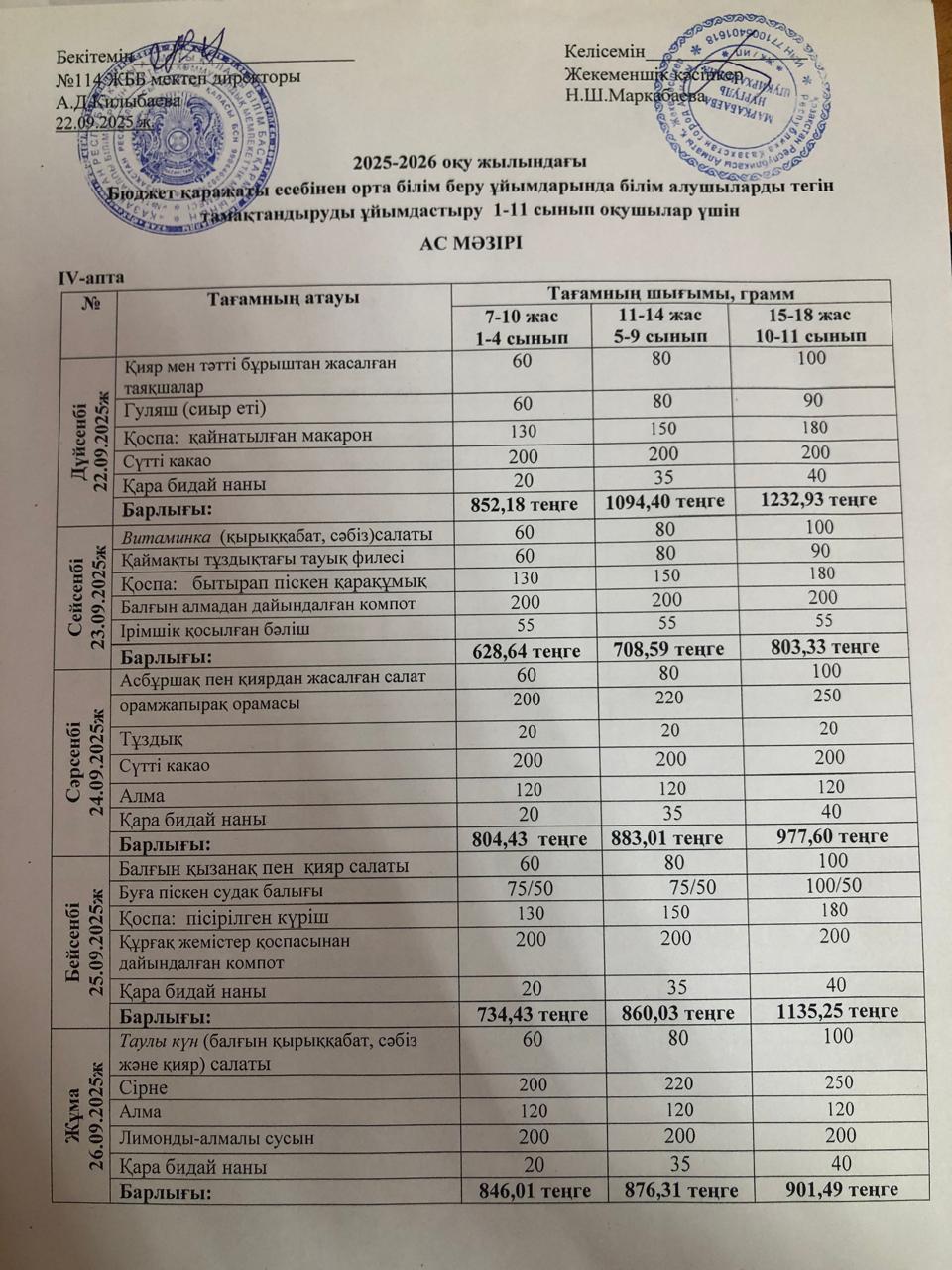 Ас мәзірі 22.09-26.09.2025 ж