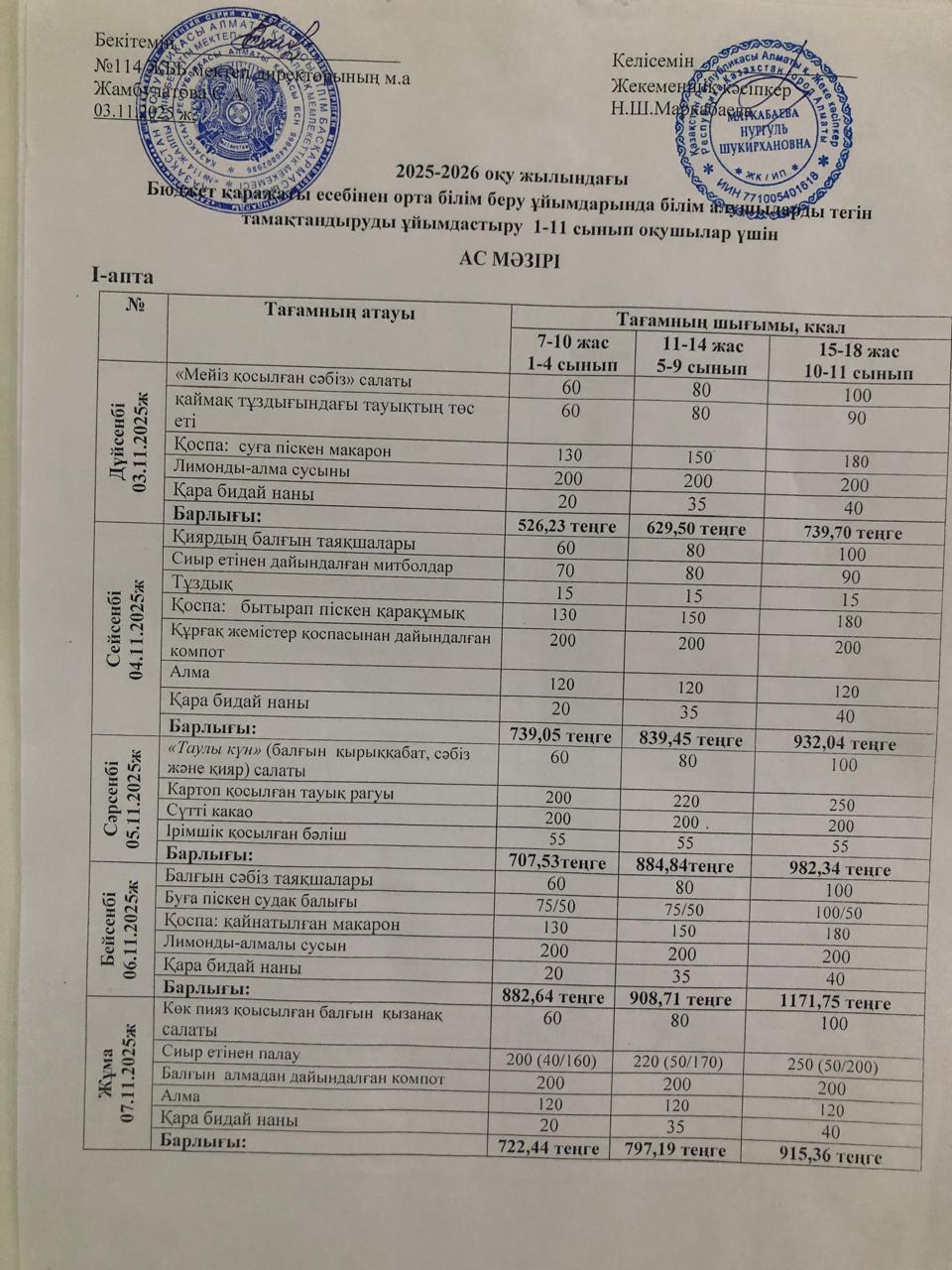 Тамақтануды ұйымдастыру бойынша жұмыс жоспары-2025