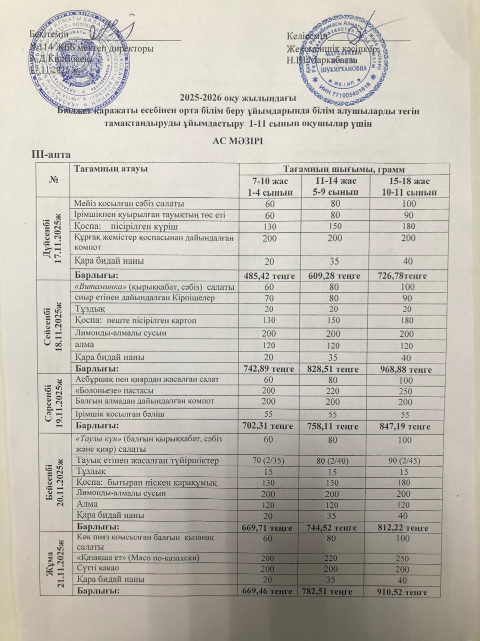 Тамақтануды ұйымдастыру бойынша жұмыс жоспары-2025